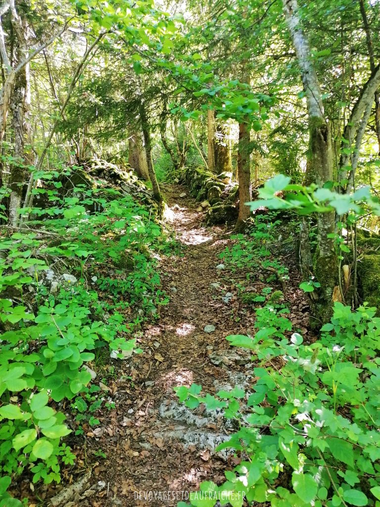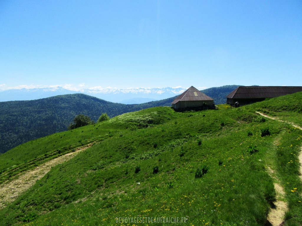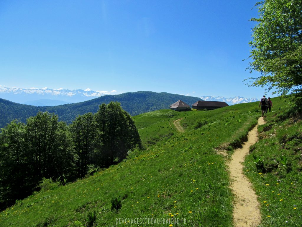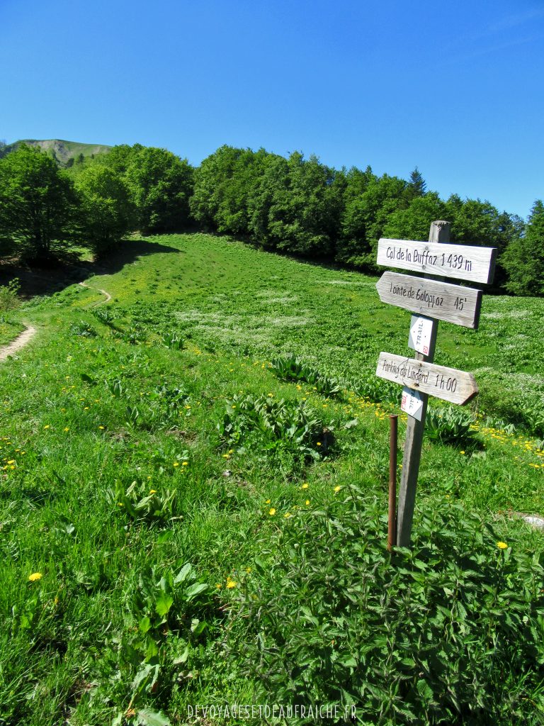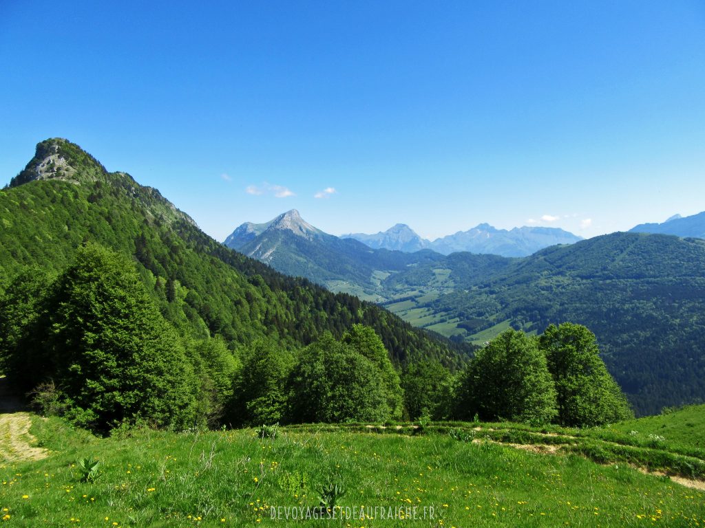 La randonnée commence par une montée sous les arbres, ce qui est plutôt agréable au vu de la fraicheur qu’ils gardent pendant que vous avancez sur une montée bien raide. Le chemin continu sous les bois jusqu’à quitter l’abri des arbres et découvrir des prairies verdoyantes et commencer à apercevoir les sommets des montagnes qui nous entourent. Arrivé au col de la Buffaz et son chalet vous êtes à mi-parcours de l’ascension jusqu’à la pointe, la vue d’ici est déjà très appréciable.