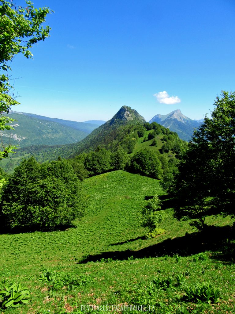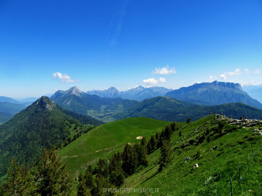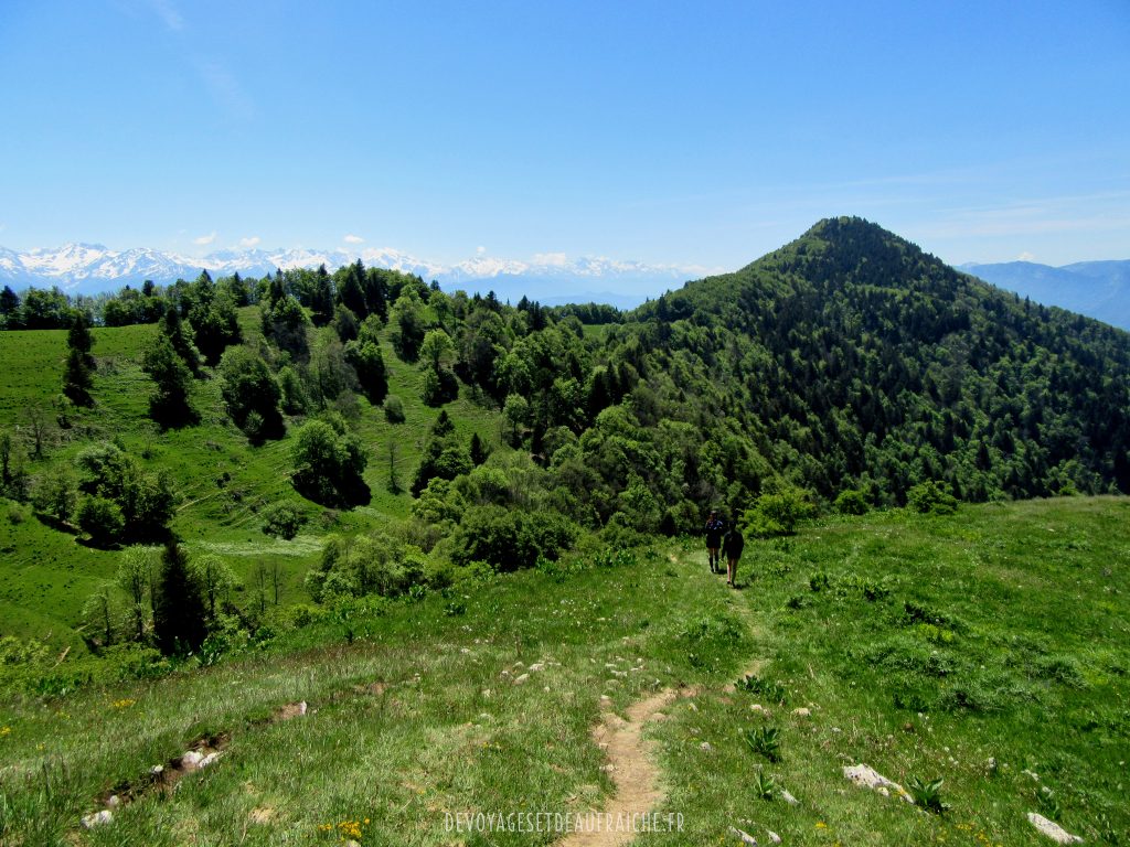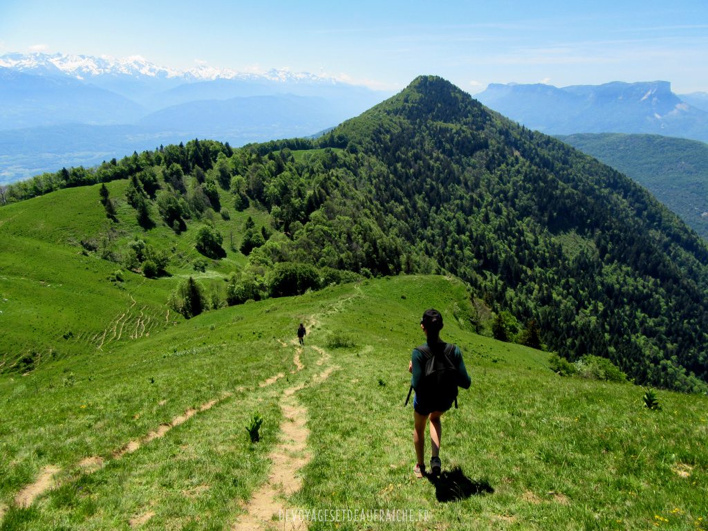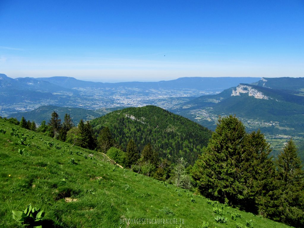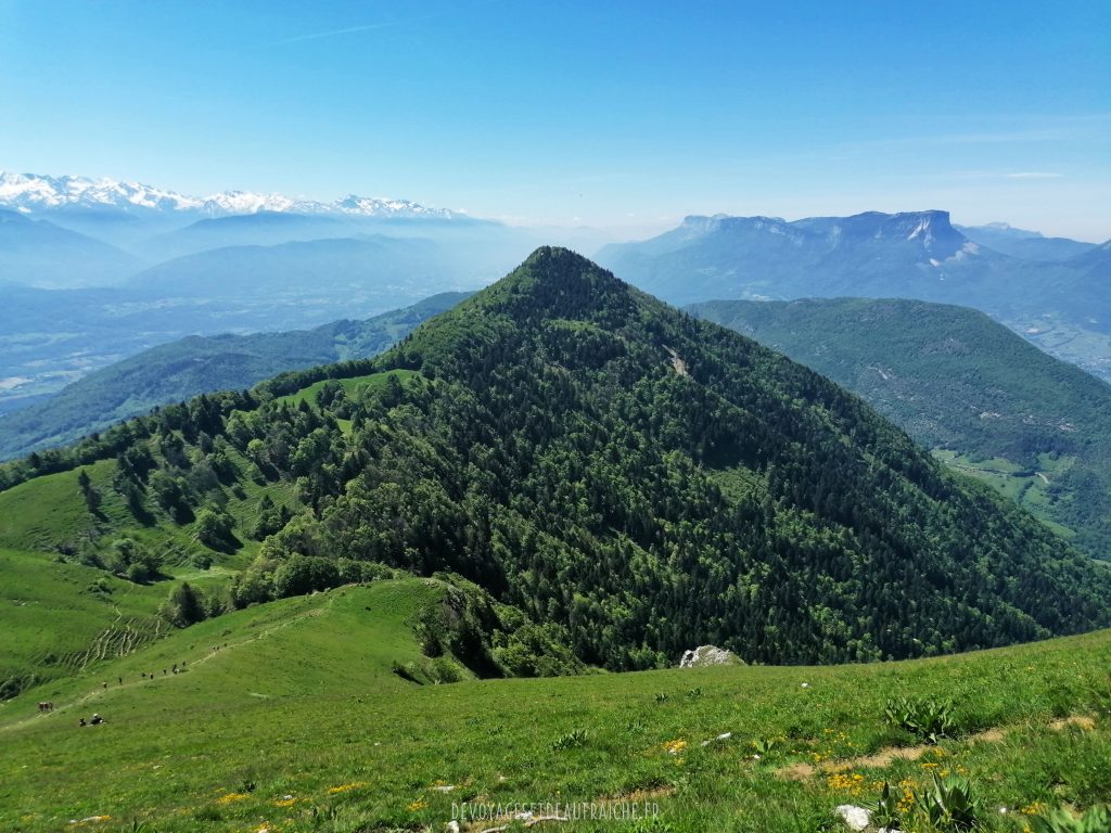 Pour continuer l’ascension vous marcherez le long de la crête jusqu’à la pointe, petit à petit vous verrez se dégager une superbe vue sur les montagnes autour. Arrivés à la pointe vous pourrez voir en contrebas la ville de Chambéry, droit devant vous le pic de la Sauge et plus au loin une superbe vue sur la face écroulée du mont Granier. Une immense étendue d’herbe vous offrira un bon endroit pour pique-niquer sans être dérangé par la foule.