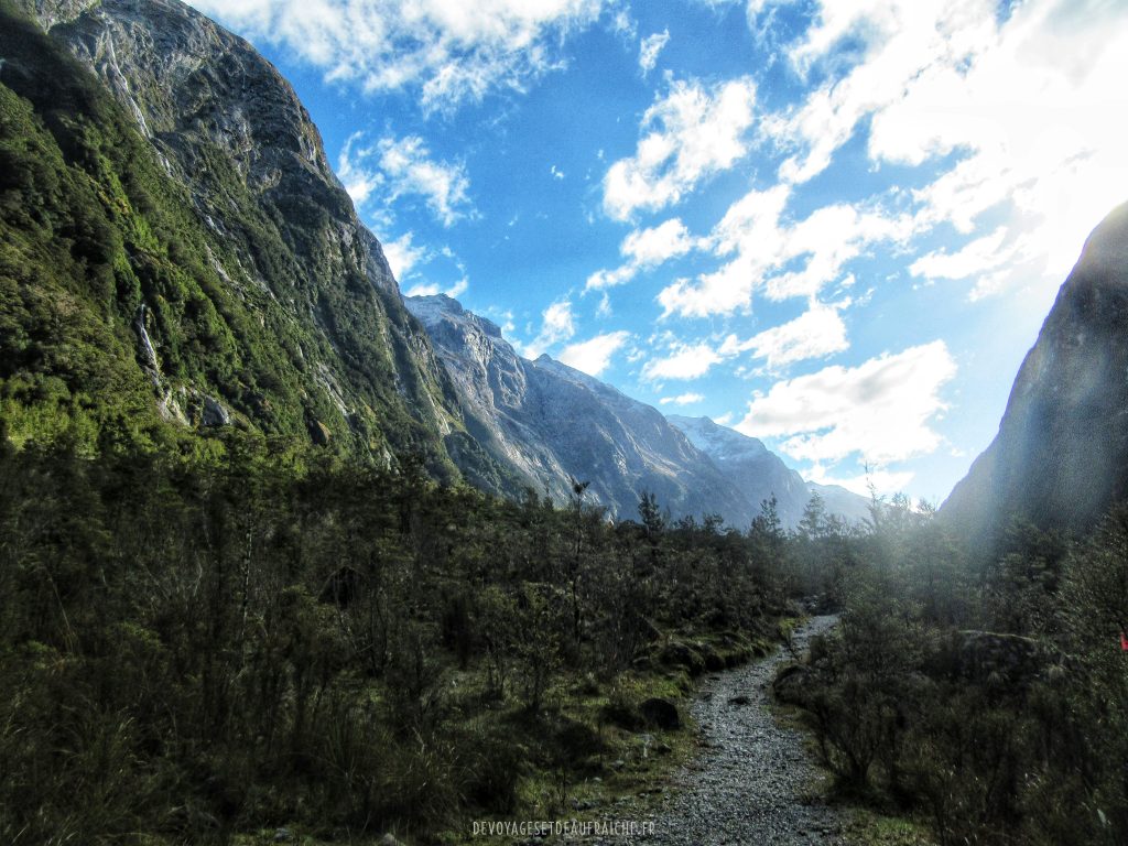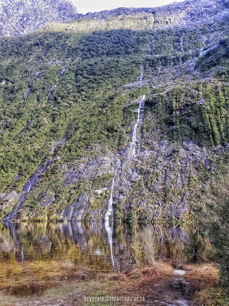 Le début de la journée commence à 7h45 à Te Anau avec la navette qui mène jusqu’où est amarré le bateau qui nous conduira jusqu’à Glade Wharf, 20 min au nord de Te Anau. Puis le voyage commence tranquillement sur le lac Te Anau pour 2h de bateau sur ces eaux paisibles surplombées par les hauts sommets et glaciers du Fjordland. La balade est magnifique, c’est une belle façon de commencer la journée. Arrivés à Glade Wharf, l’aventure commence. Le premier jour de cette randonnée étant pour moi le seul jour de beau temps, il s’agit d’avancer le plus loin possible dans le sentier, jusqu’à la hutte de Mintaro à 22km de Glade Wharf. Cette première partie du trajet se fait tout au long d’une vallée entourée de falaises abruptes animées par de nombreuses cascades qui semble surgir de la roche. Le soleil haut dans le ciel offre des couleurs fantastiques et des reflets miroirs aux différents lacs sur le chemin. On ne peut pas s’empêcher de lever le nez pour admirer les sommets des montagnes et glaciers qui nous entourent. On traverse des ruisseaux à l’eau cristalline par des ponts de bois et des rivières à sec, qu’il est probablement impossible de traverser en cas de grosse pluie sans en avoir jusqu’aux genoux… heureusement aujourd’hui il fait beau.