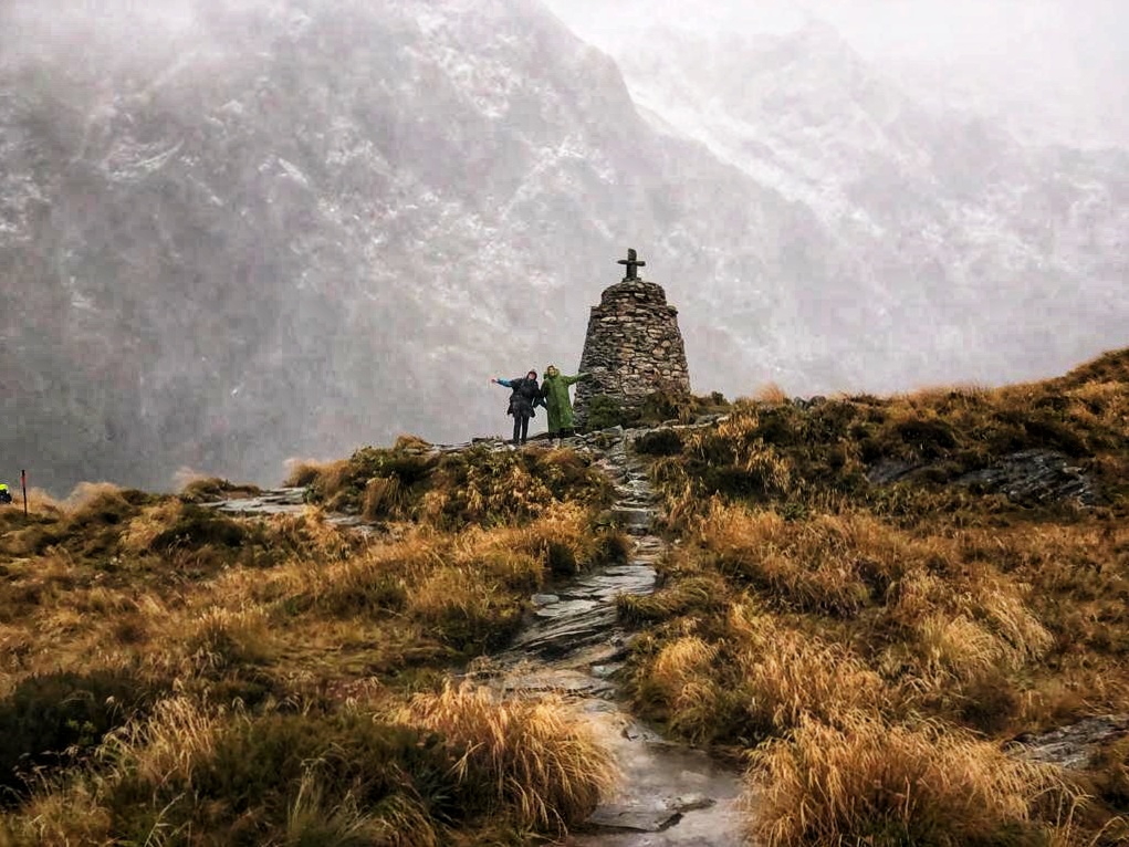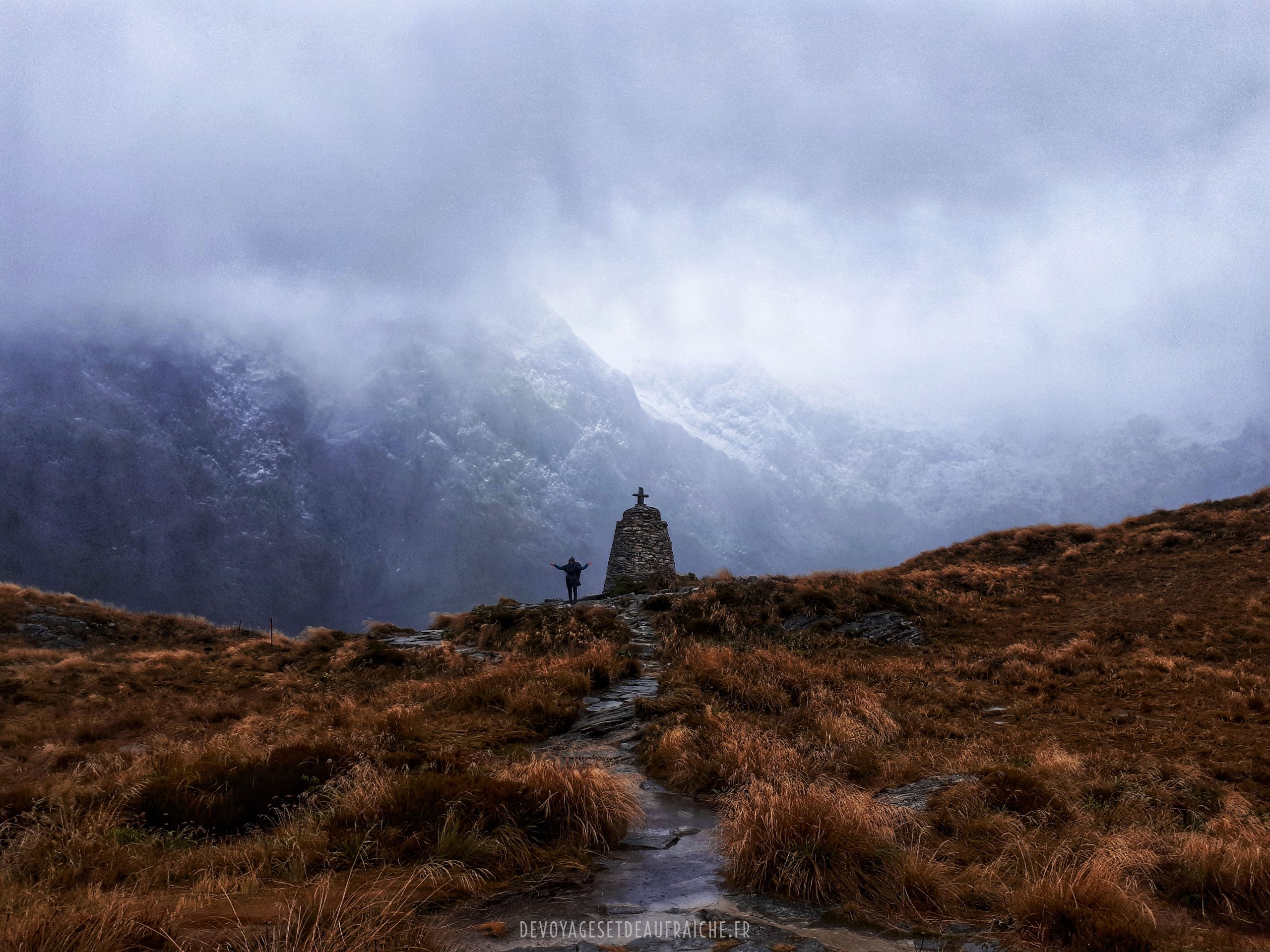 Après le déchainement des éléments la veille, la pluie ne s’est toujours pas arrêtée pour ce troisième jour de trek, les grosses gouttes résonnent encore sur la toiture de la hutte, mais tant pis il faut quand même continuer car la météo ne prévoit pas de s’améliorer. A cette étape une très bonne cape de pluie est de rigueur, elle m’a même bien sauvée, j’ai été la plus maintenue au sec de tout le groupe. Le trek sous la pluie est une expérience, pour aller jusqu’à Dumpling hut il faut passer le col de Mackinnon Pass. La première section du chemin est en partie abritée par les arbres, ce qui rend la marche plus agréable, mais l’ascension vers le col permet de prendre mesure de la force des éléments. Le chemin est devenu un ruisseau, les ruisseaux des rivières et les rivières des torrents. Chaque cours d’eau à doublé de volume et d’intensité, de nouvelles cascades apparaissent sur les flans des montagnes, comme si ce dernières pleuraient. Arrivés au col le spectacle est époustouflant, le vent se mêle à la pluie, la vue sur les deux vallées toutes encadrées d’une multitude de cascades est incroyable, les nuages denses se déchirent en neige sur les sommets, puis en pluie.