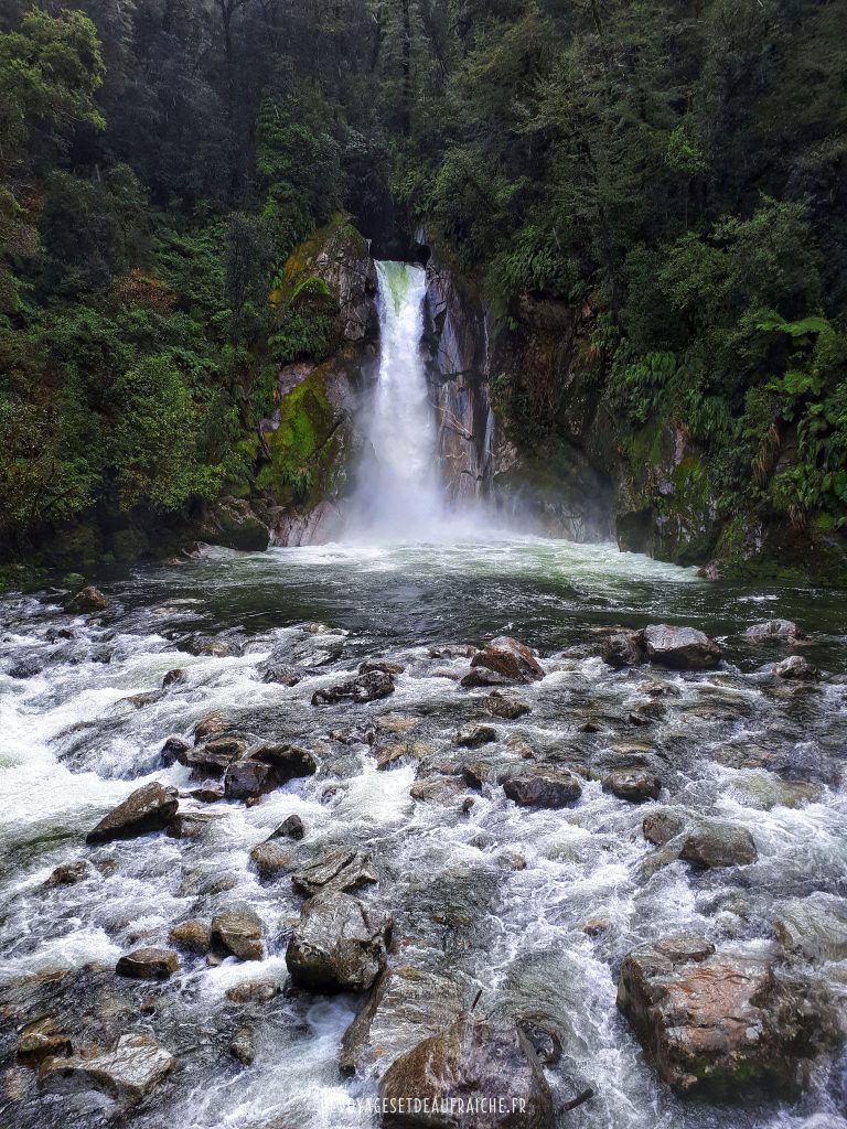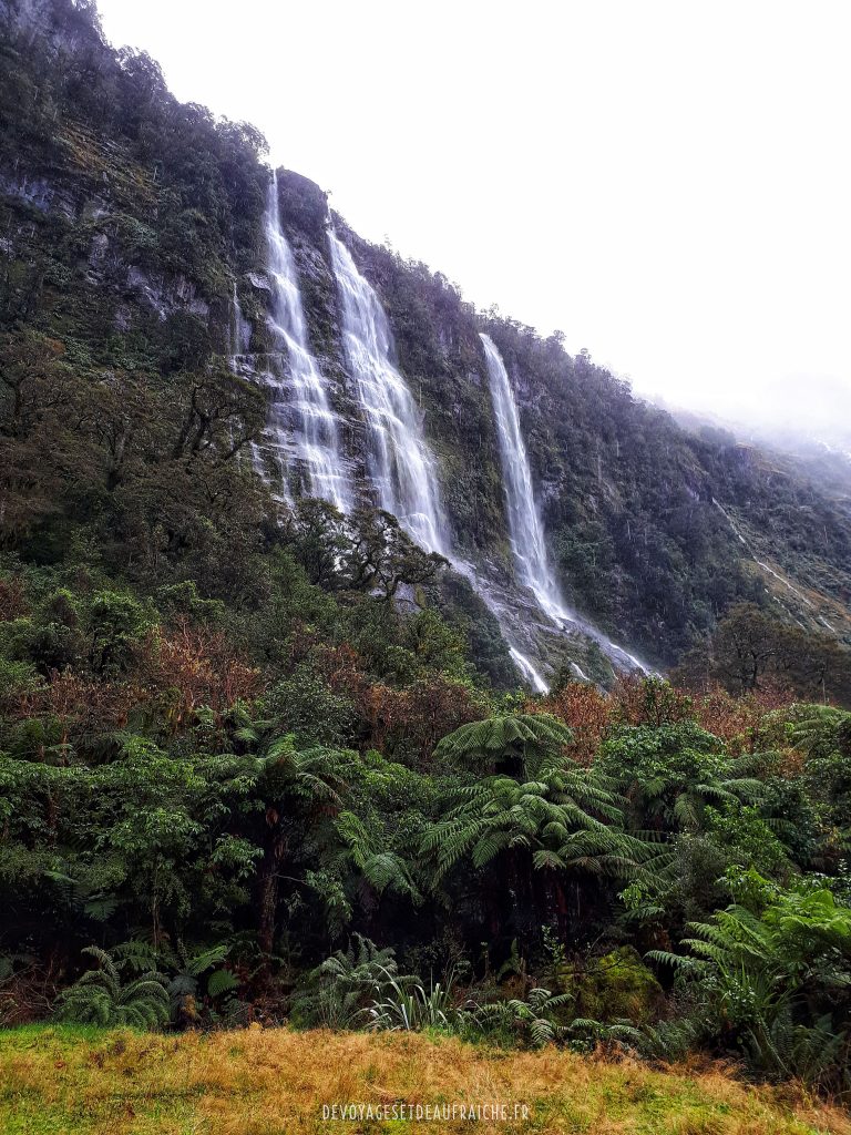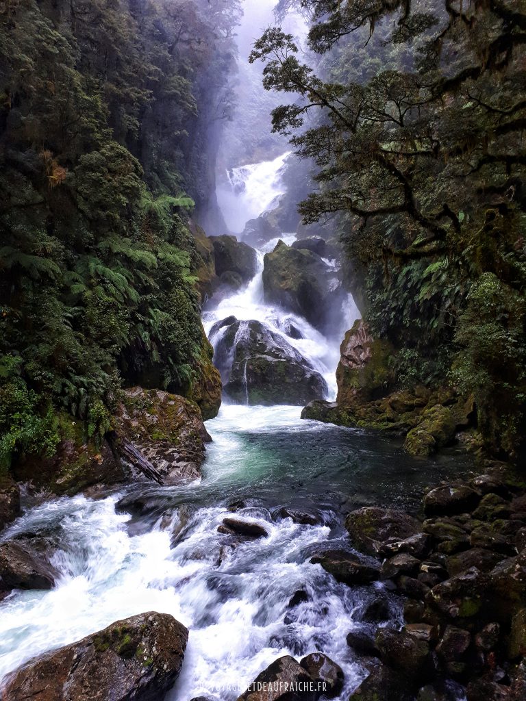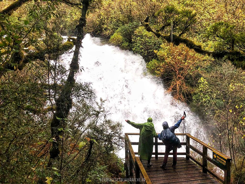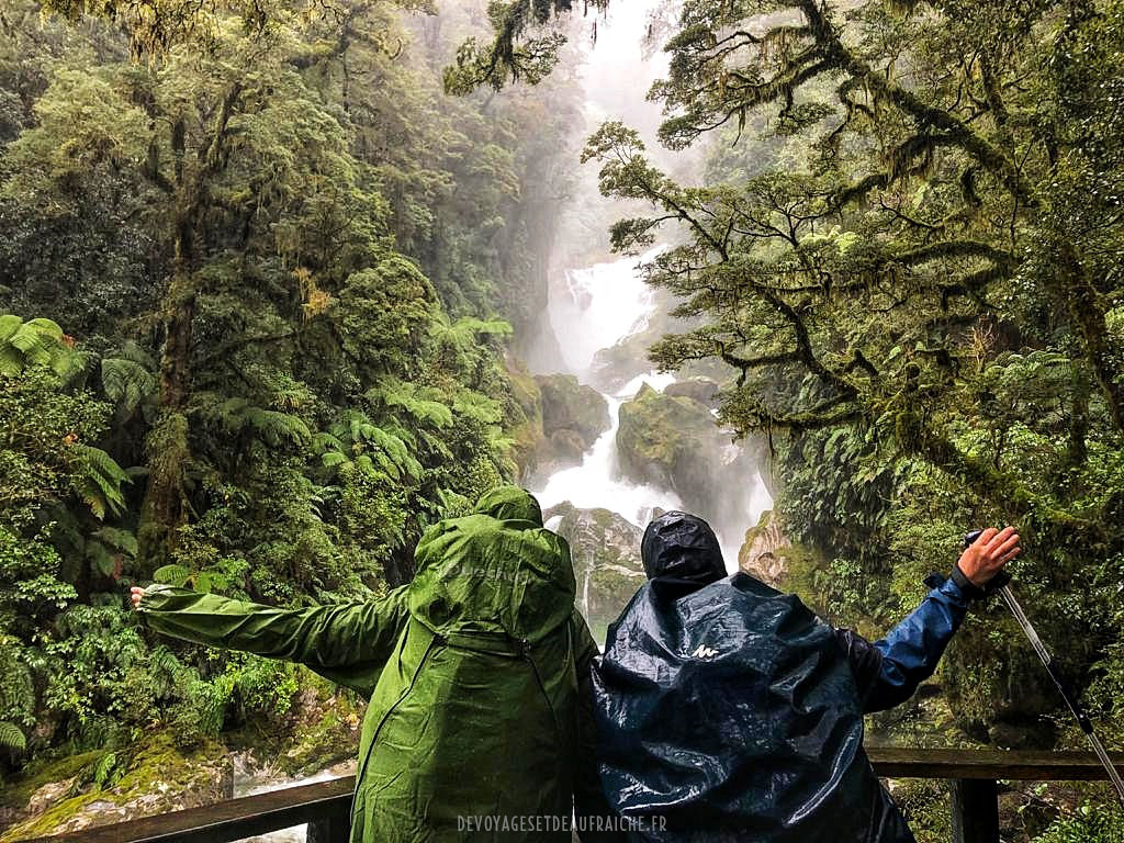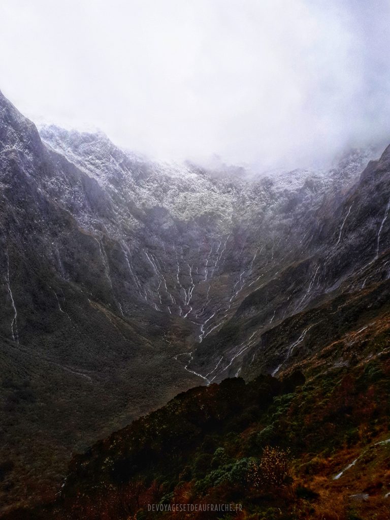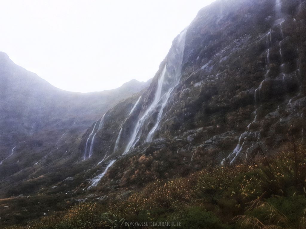 A la descente du col, c’est une nouvelle vallée qui commence par un cirque où les cascades qui affluent le long de la montagne se joignent en un torrent. Certaines n’atteignent pas le torrent et sont soufflées par des rafales de vent pour se mêler à la pluie. On empreinte des structures en bois pour descendre jusqu’à Dumpling hut, le long de cascades d’une puissance inouïe. Arrivés à Quintin shelter il est possible de faire un détour pour admirer Sutherland falls, la deuxième cascade la plus grande de Nouvelle-Zélande, 580m de haut. De près elle est impressionnante, et le souffle que produit la chute de l’eau également.