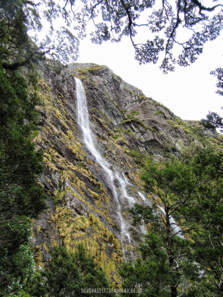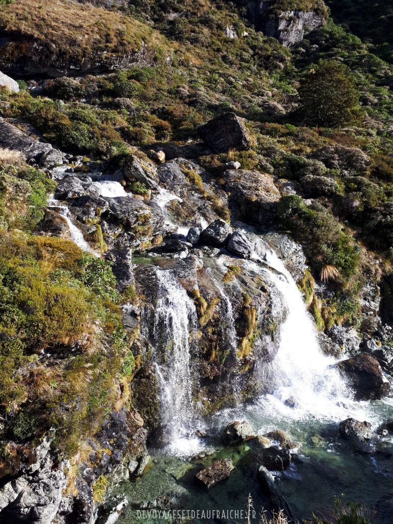 Dernier jour de cet itinéraire, des sentiers jonchés de pierres vertes jade ou violettes améthyste. Un détour par le Key summit d’où la vue sur le lac Marianne est fantastique, comme sur l’ensemble du massif montagneux. Des cascades qui viennent rythmer nos pas avec le bruit de l’eau qui coule sur les rochers. Puis finalement New Divide shelter, l’arrivée de ce trek au cœur des montagnes.