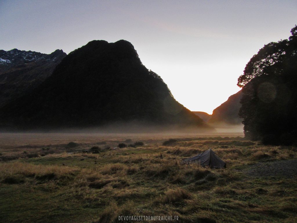 Arrivée au début de la randonnée à Routeburn Shelter grâce à une navette à 13h. Le première partie du trek jusqu’à Routeburn flats est une longue remontée dans des gorges au bord d’une rivière puissante à la couleur bleue claire cristalline. Cette partie qui ne comprend pas beaucoup de dénivelé n’est pas difficile et la balade dans ces gorges est absolument magnifique, sous les arbres fougères avec les bruit du torrent jusqu’à côté. Je pense qu’il est possible d’y faire du canyoning, en tout cas ça donne envie. Arrivée au premier campement de Routeburn Flats campsite, la tente plantée pour la nuit, les nouilles chinoises qui chauffent et surtout le spray anti sandfly prêt à dégainer ! L’emplacement est paisible, au cœur de la nature, avec vu sur les sommets qui nous entourent, et la brume qui offre un super spectacle au lever du soleil.